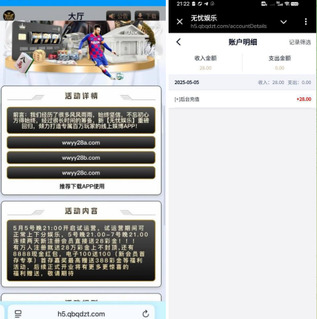 博彩直播 到账情况:自测【网站不担责】 领取方式:无忧娱乐注册回馈申请送28彩金 安全系数:低 平台资历:中 会员评分: ★☆☆☆☆ 申领网址:https://wy28.vip 提现要求:咨询平台客服 活动时间:结束时间以官方通知为准